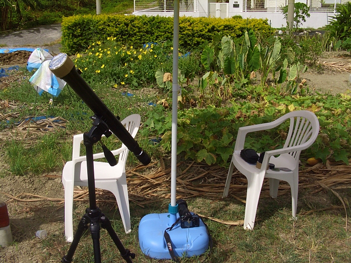 I was prepared with my pinhole viewer, solar filter viewer, my Skyscout to locate stars in the daylight sky, my laptop computer (to watch the eclipse live on the internet), and was even within a view steps of my TV where NHK would show the eclipse.