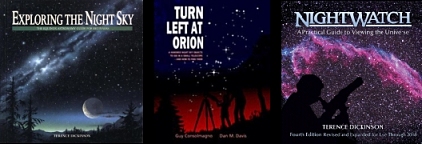 ![]() • Exploring the Night Sky, Terence Dickinson (for kids) • Nightwatch, 3rd Ed., Terence Dickinson • Turn Left at Orion, 3rd Ed., Consolmagno & Davis • The Binocular Stargazer, Leslie Peltier • The Night Sky, David Chandler • Exploring the Night Sky with Binoculars, David Chandler |