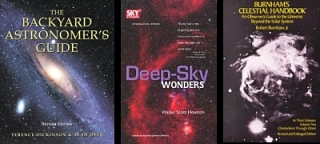 ![]() • The Backyard Astronomer's Guide, 2nd Ed., Terence Dickinson, Alan Dyer • Astronomy: A Self-Teaching Guide, 5th Ed., Dinah Moche • Night Sky Observer's Guide, George Kepple and Glen Sanner (two volumes) • Deep Sky Wonders, Walter Scott Houston • The Deep Sky: An Introduction, Phil Harrington • Burnham's Celestial Handbook, Robert Burnham, Jr. (three volume set) |