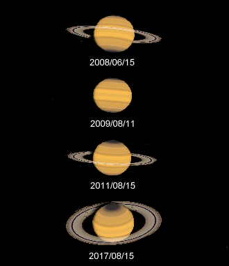 The sequence shows the tilt angle of Saturn's ring from 2008 thru 2017.
